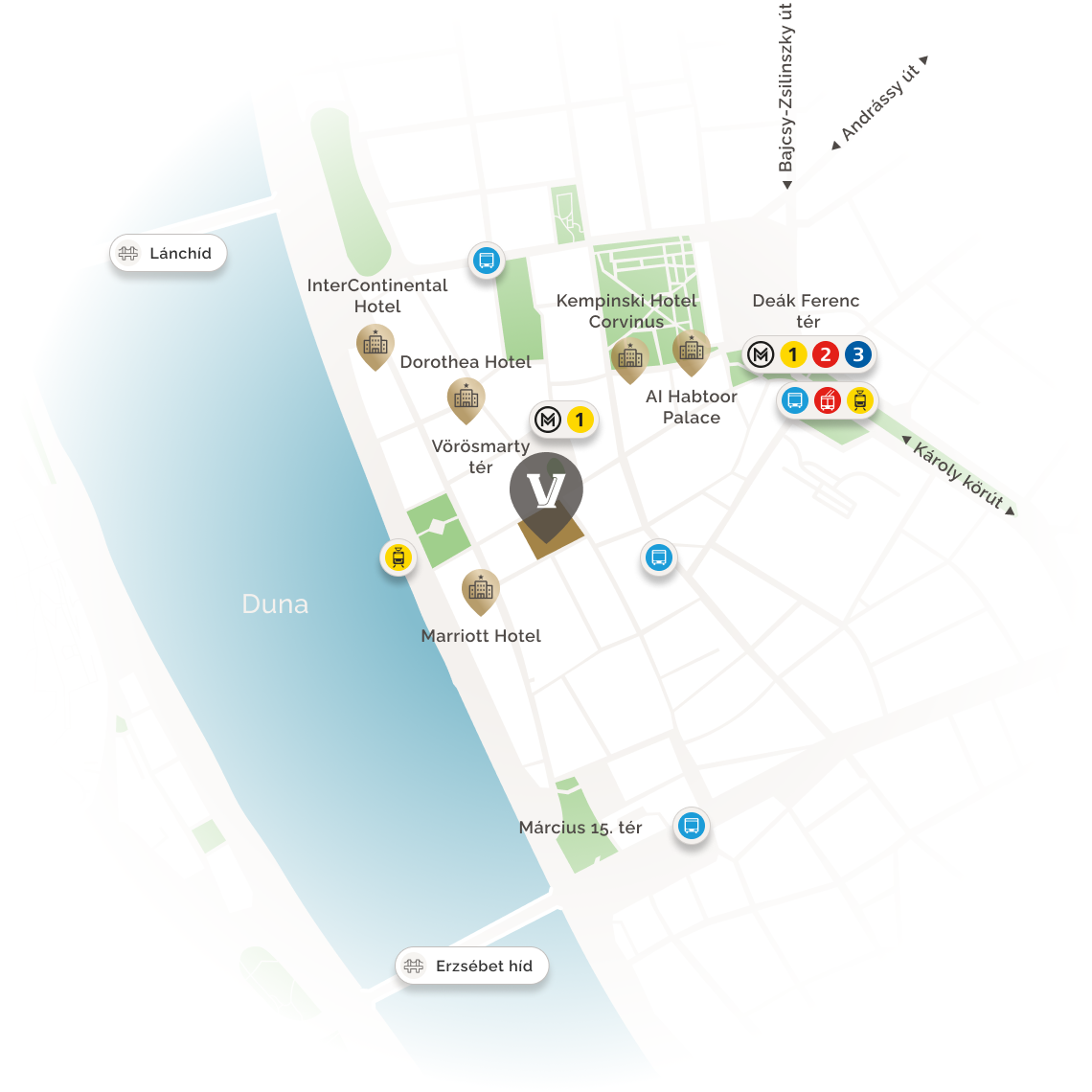 Váci 1 is located in the central business and cultural district of Budapest, in the immediate vicinity of historic and touristic sights, a high-end pedestrian shopping area (Fashion Street, Váci Street, Vörösmarty Square), and several 5-star hotels such as Kempinski, El Habtoor Palace, Intercontinental, Marriott and Dorothea Hotel (Autograph Collection).